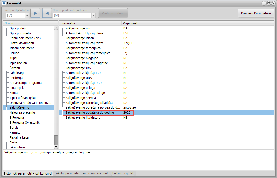 Opcija Zaključavanje podataka do godine – za poslovnu godinu koju upišete nisu dopuštene promjena, umetanje ni brisanje u bilo kojem KIS modulu. Naravno zaključane su i sve prethodne poslovne godine.
