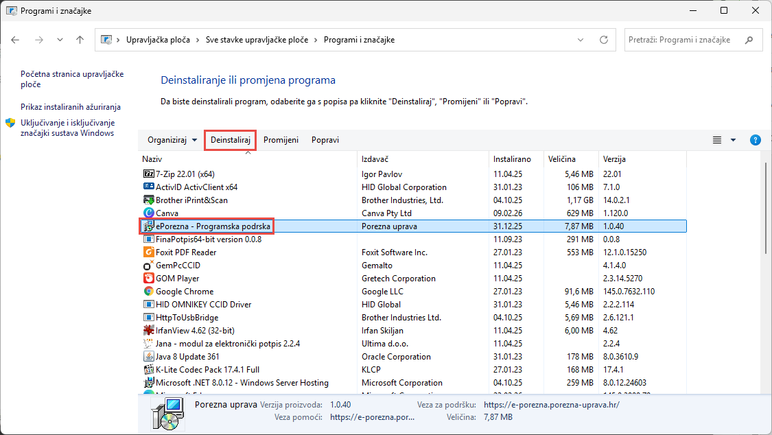 TREĆI korak - pronađite ePorezna - programska podrška i deinstalirajte ju